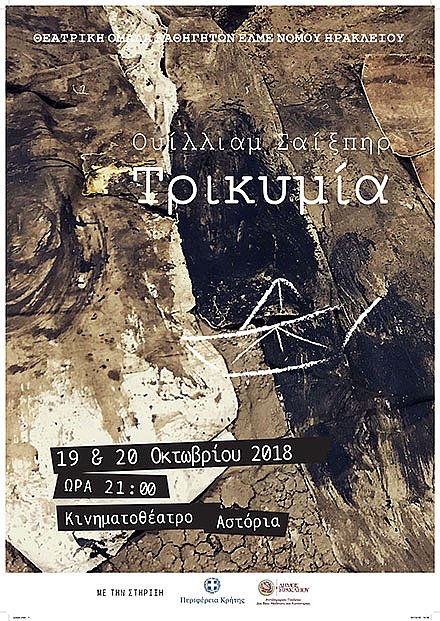 Η θεατρική ομάδα Καθηγητών ΕΛΜΕ Νομού Ηρακλείου παρουσιάζει το έργο του Γουίλιαμ Σαίξπηρ "Τρικυμία".Τα έσοδα μίας παράστασης θα δοατεθούν για τους σκοπούς του συλλόγου Φίλων της Αιματολογικής Κλινικής ΠΑΓΝΗ "ΑΝΑΓΕΝΝΗΣΗ"